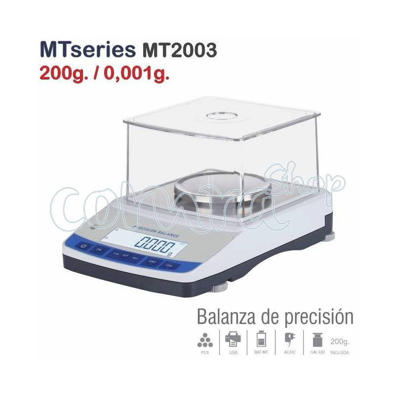 Balanza MTseries Mod. MT203. Capacidad 200 gr. / 0,001 gr. (1000 ct. / 0,01ct.). Báscula de Alta Precisión y Quilatero, de dimensiones reducidas, es ideal para joyería, gemología, laboratorio.