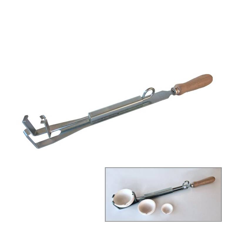 Fabricado en acero galvanizado con mango de madera que proporciona buena resistencia térmica y mecánica, el resorte mantiene una buena tensión, para asegurar al usuario que los crisoles no se resbalen o se muevan durante el proceso de volcado.