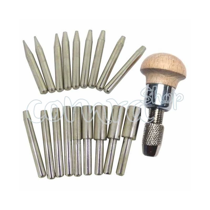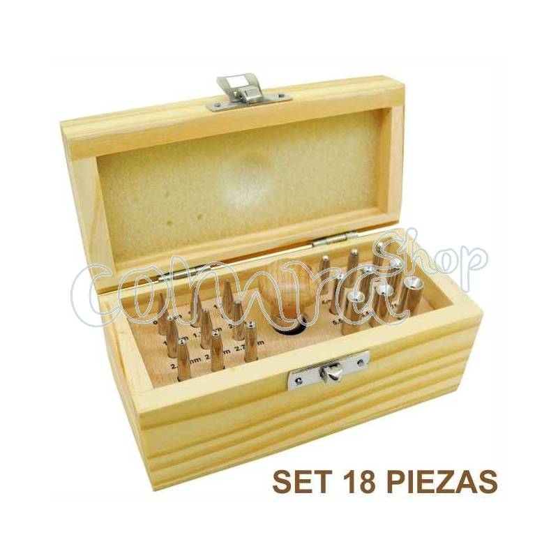 Este conjunto incluye 18 punzones de diferentes medidas entre 0,75 a 7,75 mm. de diámetro. Además, cuenta con un mango de madera con pinza para sujetar los punzones y una caja de almacenamiento de madera etiquetada con el tamaño de cada punzón. Calidad Import.