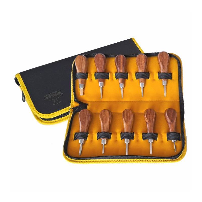 Estuche con un conjunto de herramientas que le permiten realizar una variedad de tareas de colocación de piedras y lograr resultados profesionales. Herramientas fabricada en acero, muy prácticas para engastadores y artesanos. 10 diferentes formas con arista redondeadas. Para empujar garras y ceñir firmemente biseles o boquillas alrededor de las piedras. También es utilizado para el ajuste y terminación de vidrieras, ventanas o mosaicos de vidrio multi-color con bandas de plomo.