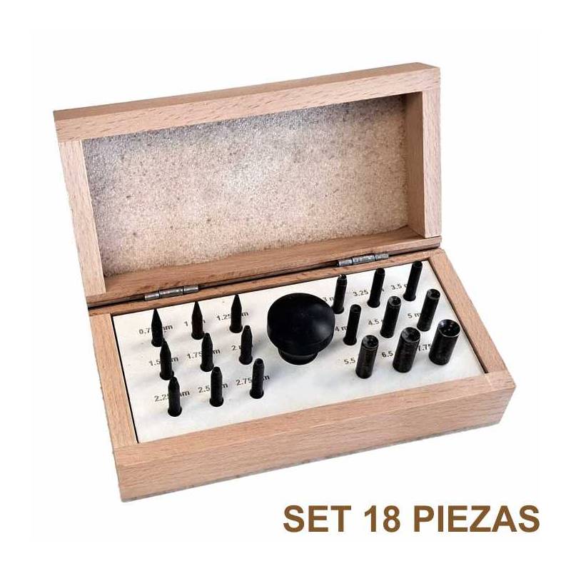 Este conjunto incluye 18 punzones de diferentes medidas entre 0,75 a 7,75 mm. de diámetro, con un mango de color negro y pinza para sujetar los punzones. Van perfectamente ordenados en una caja de almacenamiento de madera etiquetada con el tamaño de cada punzón. Calidad Import.