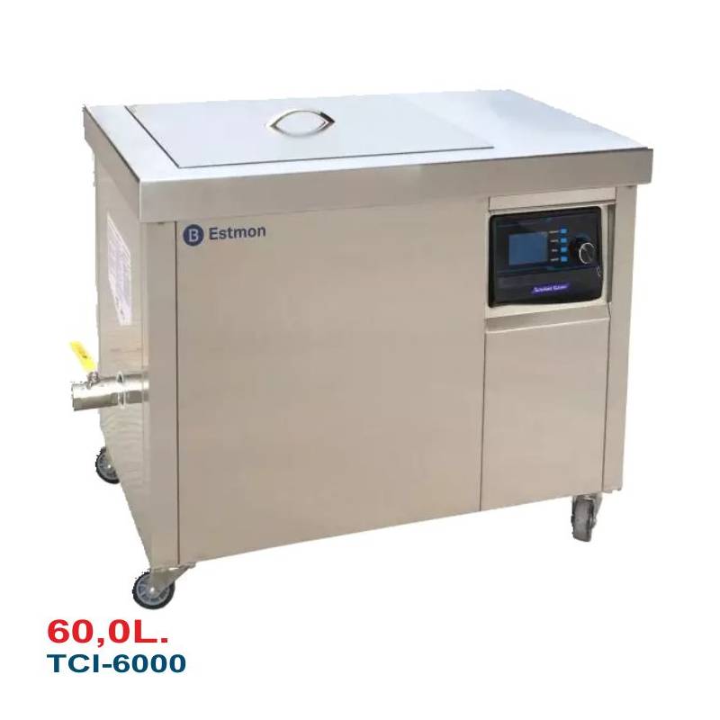 Equipo de Limpieza por Ultrasonidos Esmont TCI-6000 Industrial, 60 Litros. Fabricado en acero inoxidable de alta calidad, dispone de: Calefacción, Control electrónico de alta precisión, Pantalla LCD digital, Función memoria, Tres modos de limpieza, Ajuste de potencia (10–100 %), Cesto porta piezas, Válvula de desagüe y Tapa.