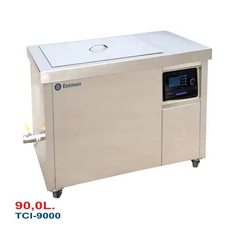 Equipo de Limpieza por Ultrasonidos Esmont TCI-9000 Industrial, 90 Litros. Fabricado en acero inoxidable de alta calidad, dispone de: Calefacción, Control electrónico de alta precisión, Pantalla LCD digital, Función memoria, Tres modos de limpieza, Ajuste de potencia (10–100 %), Cesto porta piezas, Válvula de desagüe y Tapa.