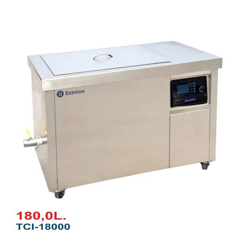 Equipo de Limpieza por Ultrasonidos Esmont TCI-18000 Industrial, 180 Litros. Fabricado en acero inoxidable de alta calidad, dispone de: Calefacción, Control electrónico de alta precisión, Pantalla LCD digital, Función memoria, Tres modos de limpieza, Ajuste de potencia (10–100 %), Cesto porta piezas, Válvula de desagüe y Tapa.