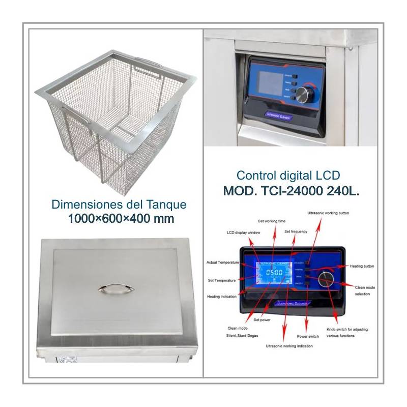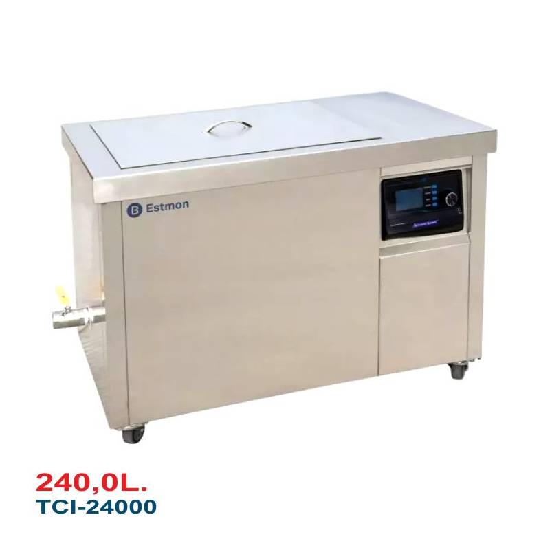Equipo de Limpieza por Ultrasonidos Esmont TCI-24000 Industrial, 240 Litros. Fabricado en acero inoxidable de alta calidad, dispone de: Calefacción, Control electrónico de alta precisión, Pantalla LCD digital, Función memoria, Tres modos de limpieza, Ajuste de potencia (10–100 %), Cesto porta piezas, Válvula de desagüe y Tapa.