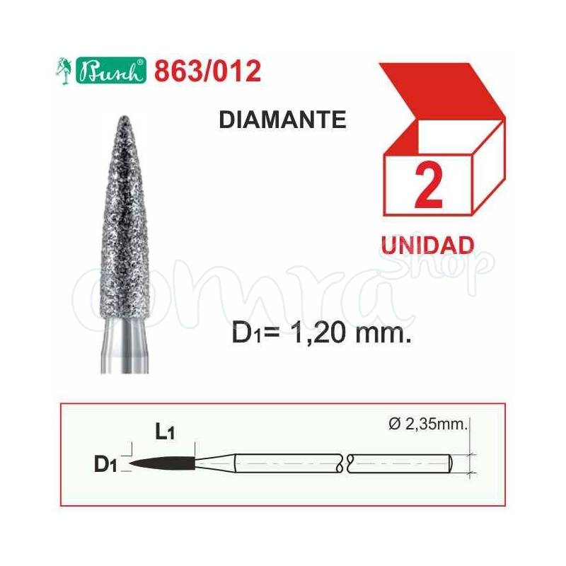 Fresa Diamantada, Punta de Diamante Fig. 863/012 Punta Cónica 1,2 mm. Caja de 2. Busch, Germany made.