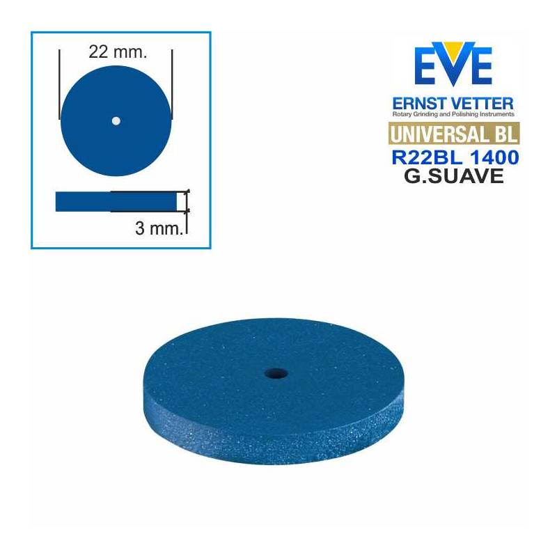Goma Abrasiva EVE UNIVERSAL BL R22bl-1400. Azul Oscuro, forma Circular 22x3 mm. Grano Medio/Suave; Abrillantado mate sedoso en metales preciosos.