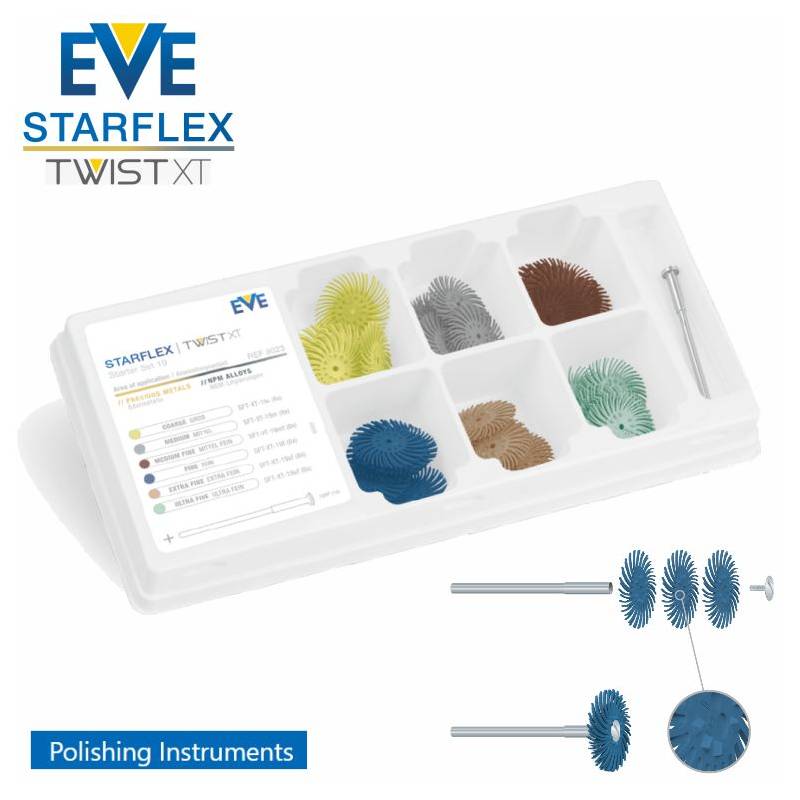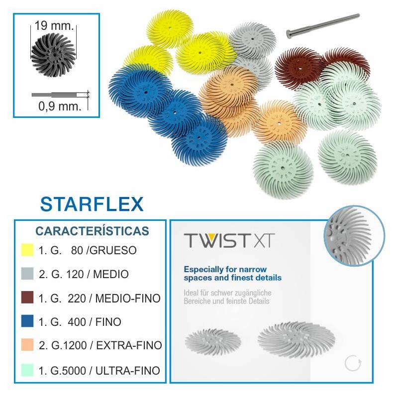 Surtido de 48 Pulidores STARFLEX TWIST XT - 9023. Pulidores de goma abrasiva forma Radial Doble de 19,0x0,9m. de "Filamentos Delgados", para pulido en brillo de Metales preciosos y no preciosos. EVE, Germany.