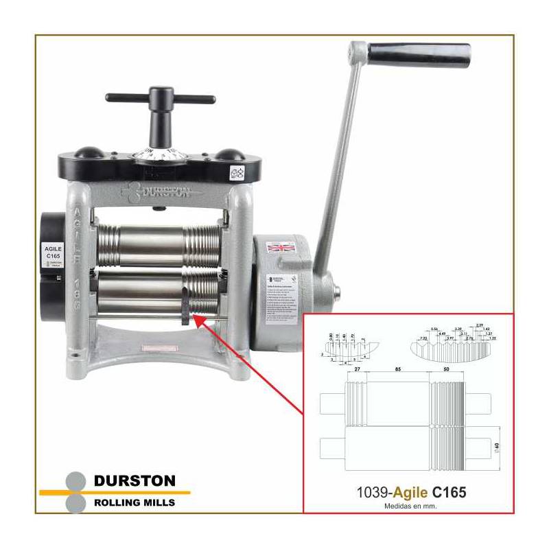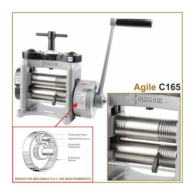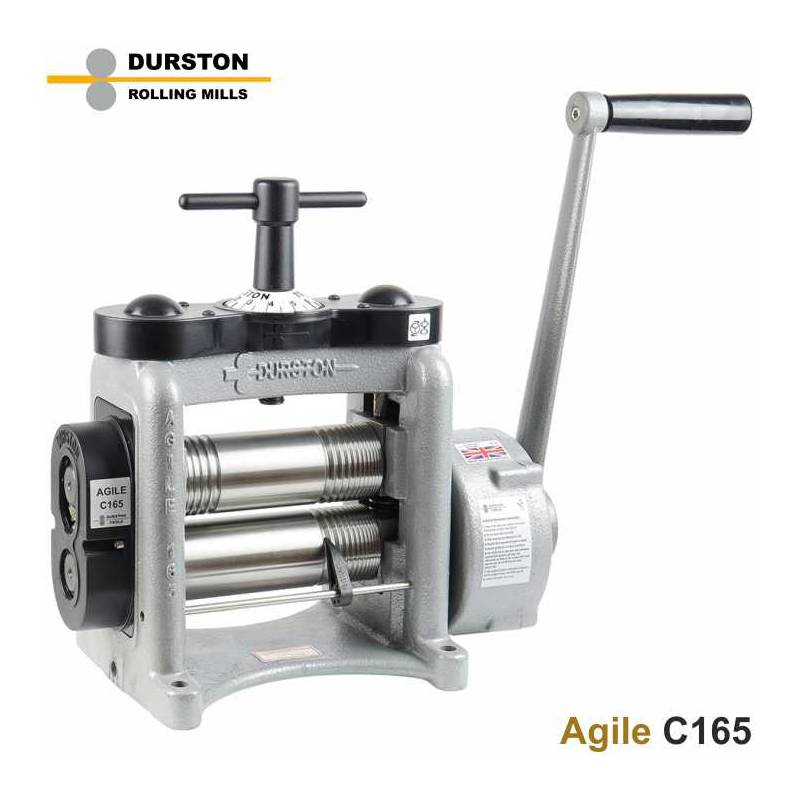 Laminador Agile - El nuevo Agile C165 es una edición especial de la gama de laminadores Durston, que proviene de la misma familia del DRM C100 RE. La gama de laminadores manuales DRM de Durston a lo largo de los años, ha demostrado ser un verdadero caballo de batalla en muchos talleres y fábricas de joyerías. En el Agile "C165" la "C" significa "Combinado" lo que le permite estirar chapas, hilos y medias cañas de metal.
