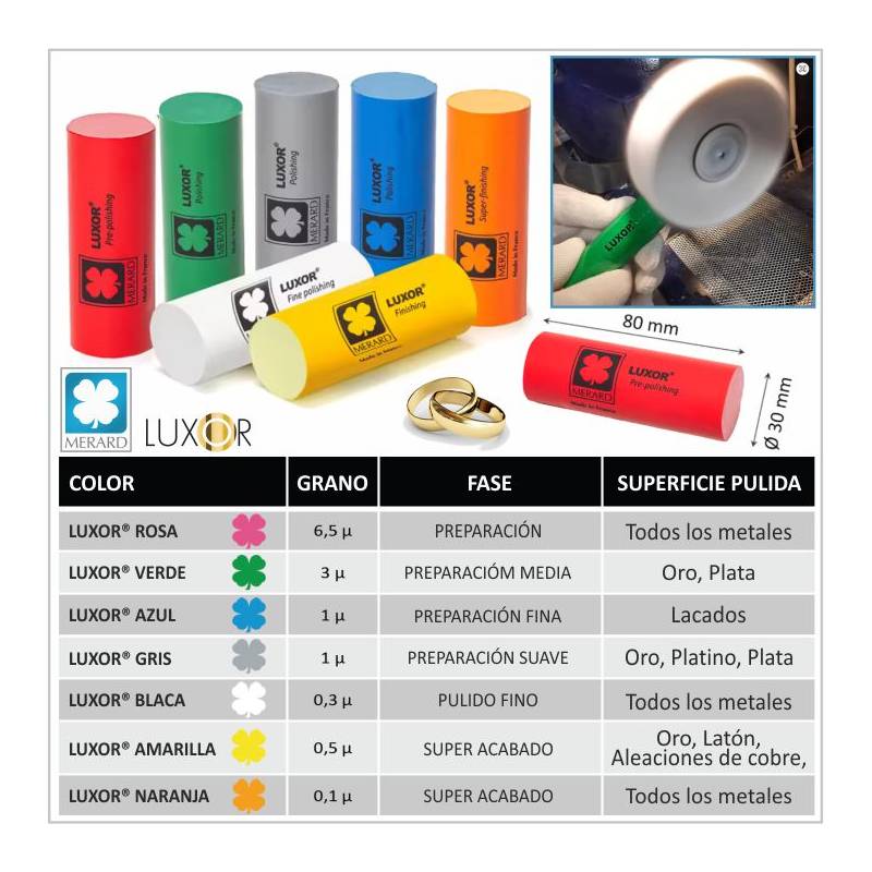 Las Pastas de pulir Luxor® de Merard, están fabricadas con ingredientes de alta calidad (sin sílice). Una composición elaborada según estrictas especificaciones, con un 70 % de óxido de aluminio, ofreciendo doble poder abrasión para el acabado de sus diseños de joyería. Esta alta concentración de óxido de aluminio, reduce el tiempo de trabajo y facilita la preparación, pulido y acabado en brillo espejo de forma eficiente de todas las superficies metálicas especialmente metales no férricos como; oro, platino, plata, aluminio, zamac, latón o bronces, etc.