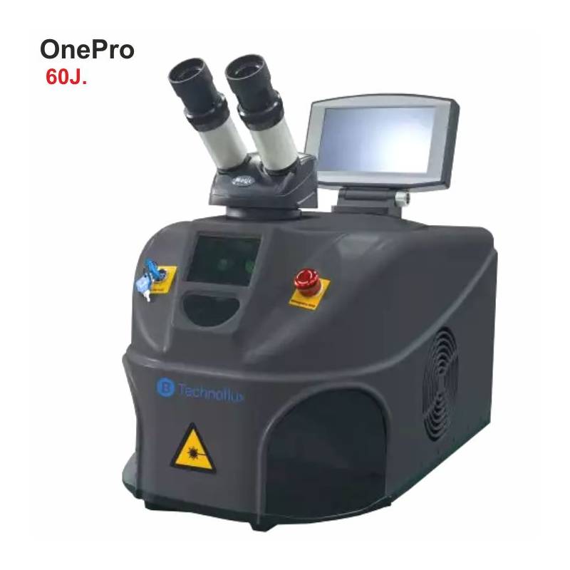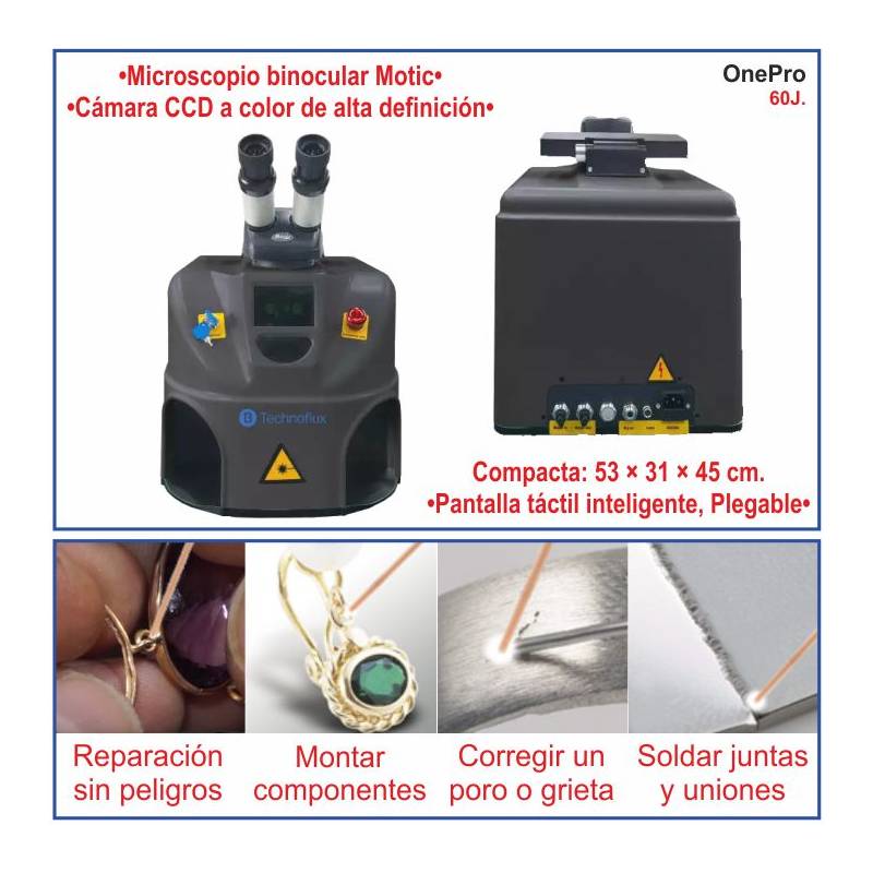 Soldador "Technoflux Laser One Pro 80W/60J". Soldador Láser Profesional de 60 Julios, Sistema óptico de alta definición y Cámara CCD a color que permite una visualización nítida del punto de soldadura (0,1–3,0mm). Pantalla Táctil digital para el ajuste rápido de parámetros y gestión de programas personalizados.
