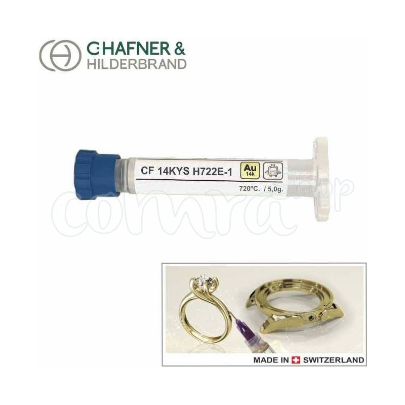 Soldadura en Pasta para Soplete. Oro Amarillo de 14 K. P. Fusión 720ºC. Jeringa envase de 5 gr. Jeringa envase de 5 gr. Fabricación C.Hafner & Hilderbrand Suiza